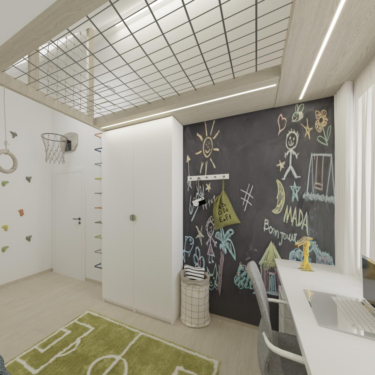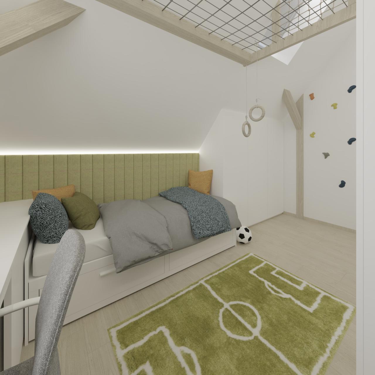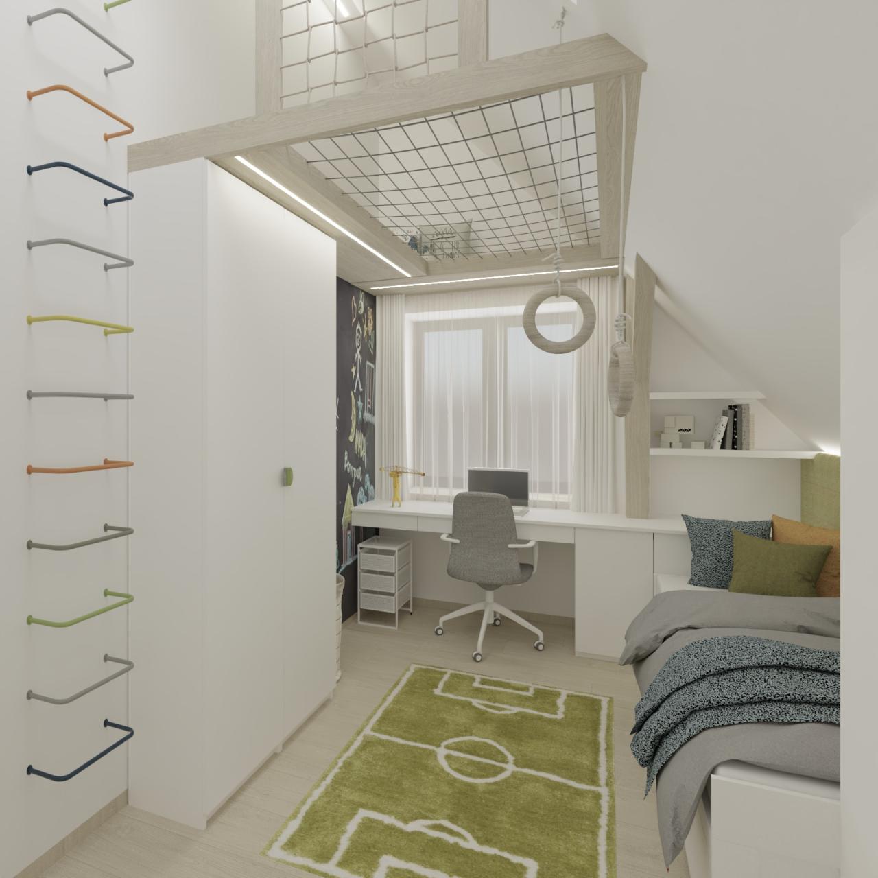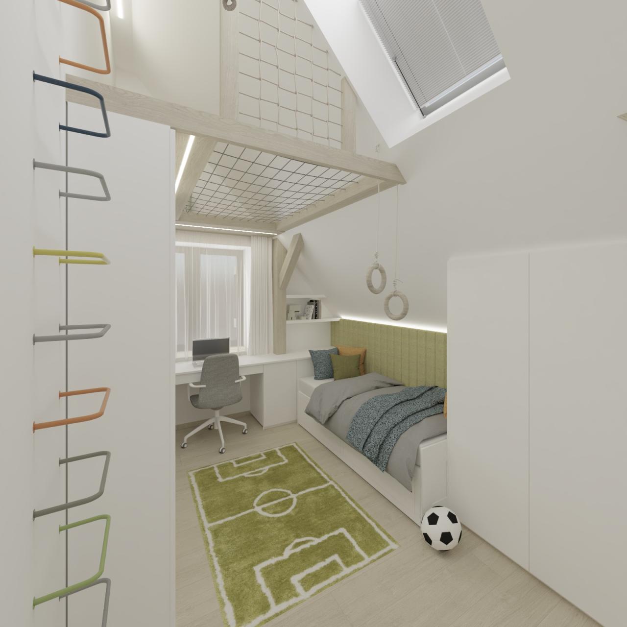 Moderní a funkční pokoj je chytře rozdělen na zóny pro aktivitu, učení a odpočinek. Vyvýšené hrací patro s přístupem po barevné žebřinové stěně šetří prostor. Pod ním je prosvětlená zóna.