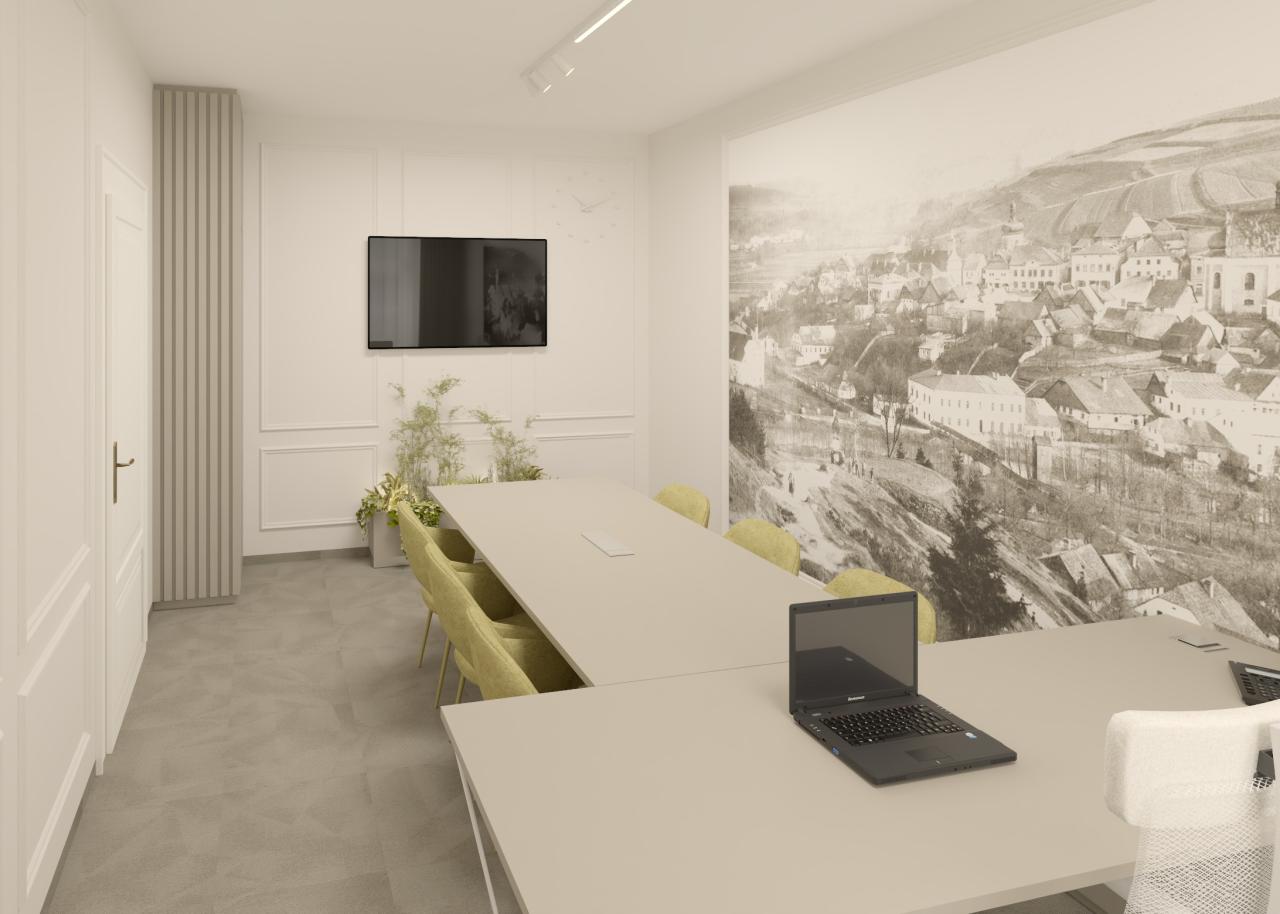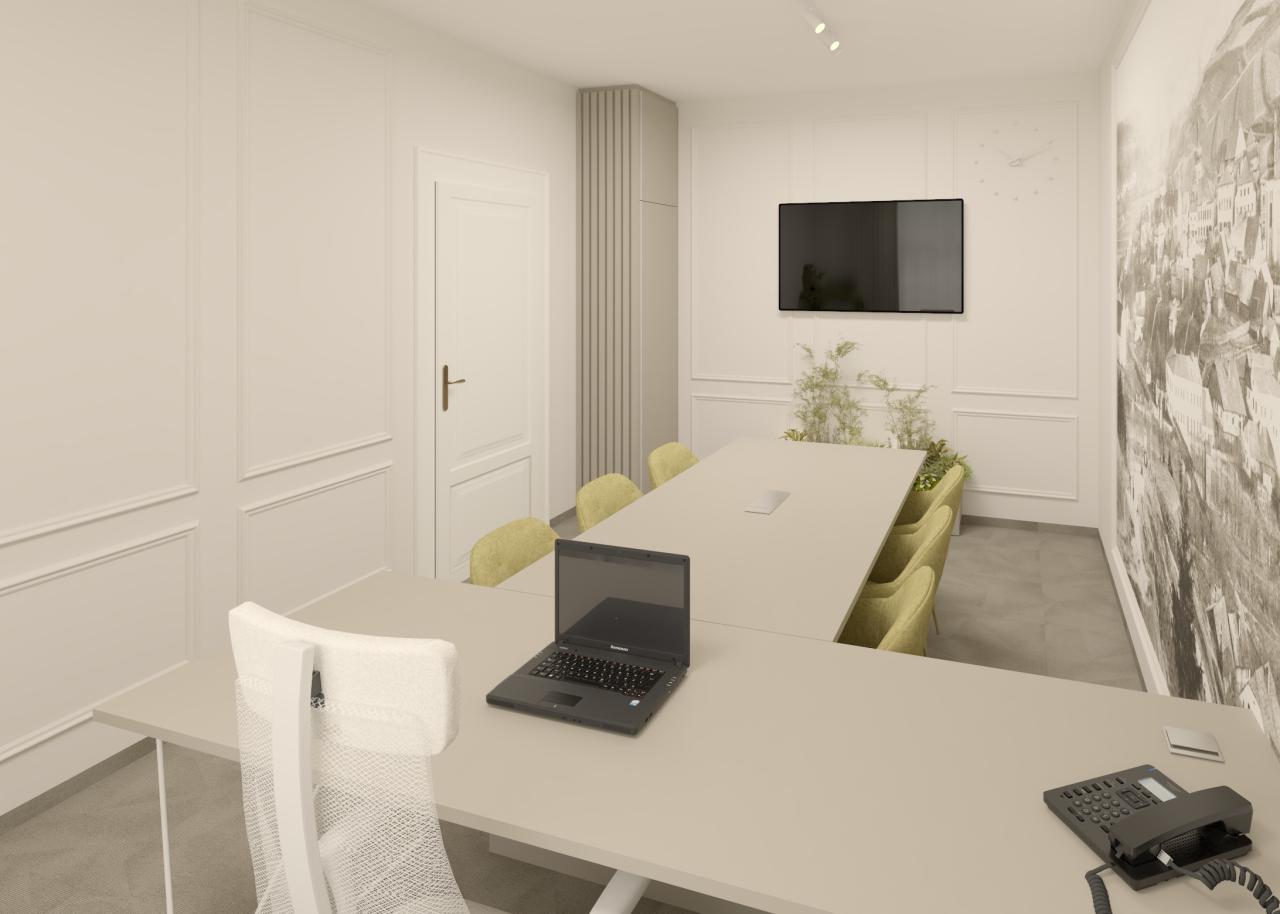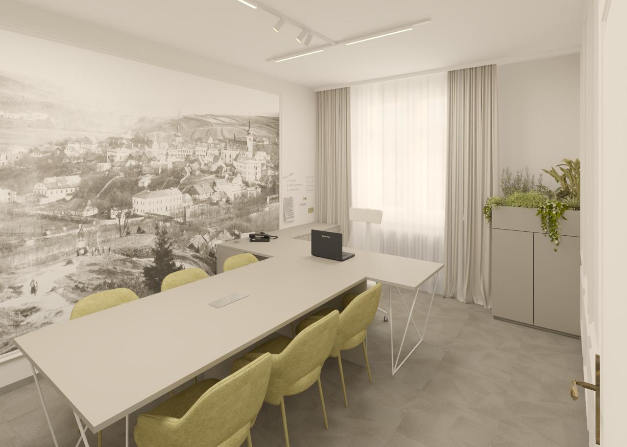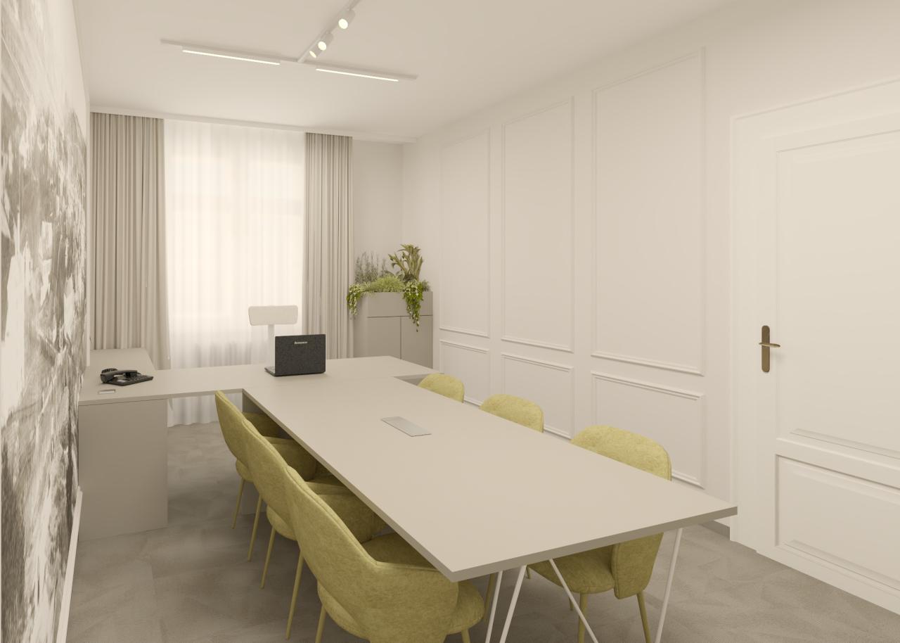 Dominantním prvkem je velký pracovní stůl s bílou deskou a moderními bílými kovovými nohami, který poskytuje dostatek prostoru pro několik pracovních míst. Kolem stolu jsou rozmístěny pohodlné kancelářské židle v světlém olivově zeleném odstínu, které dodávají prostoru jemný barevný akcent.