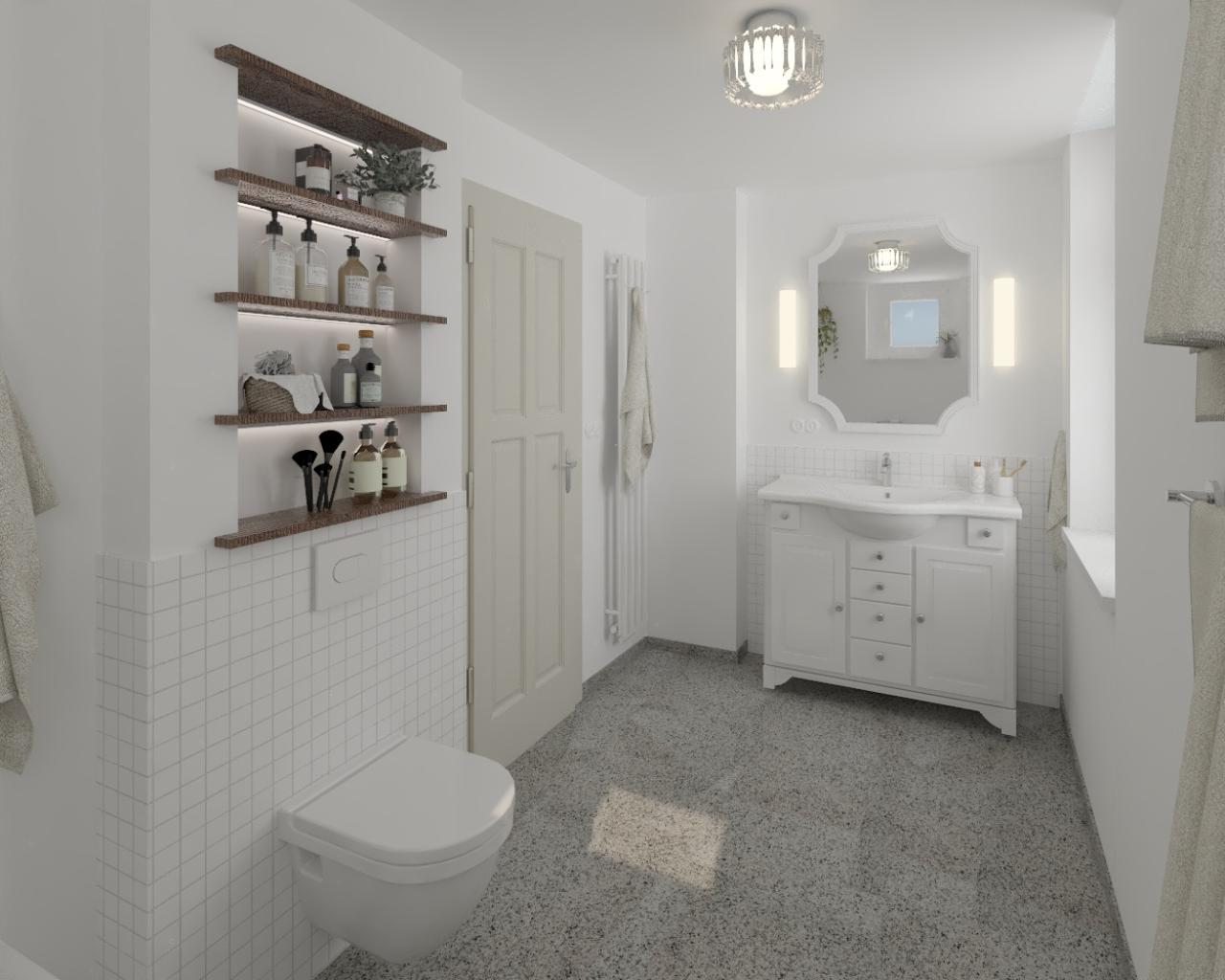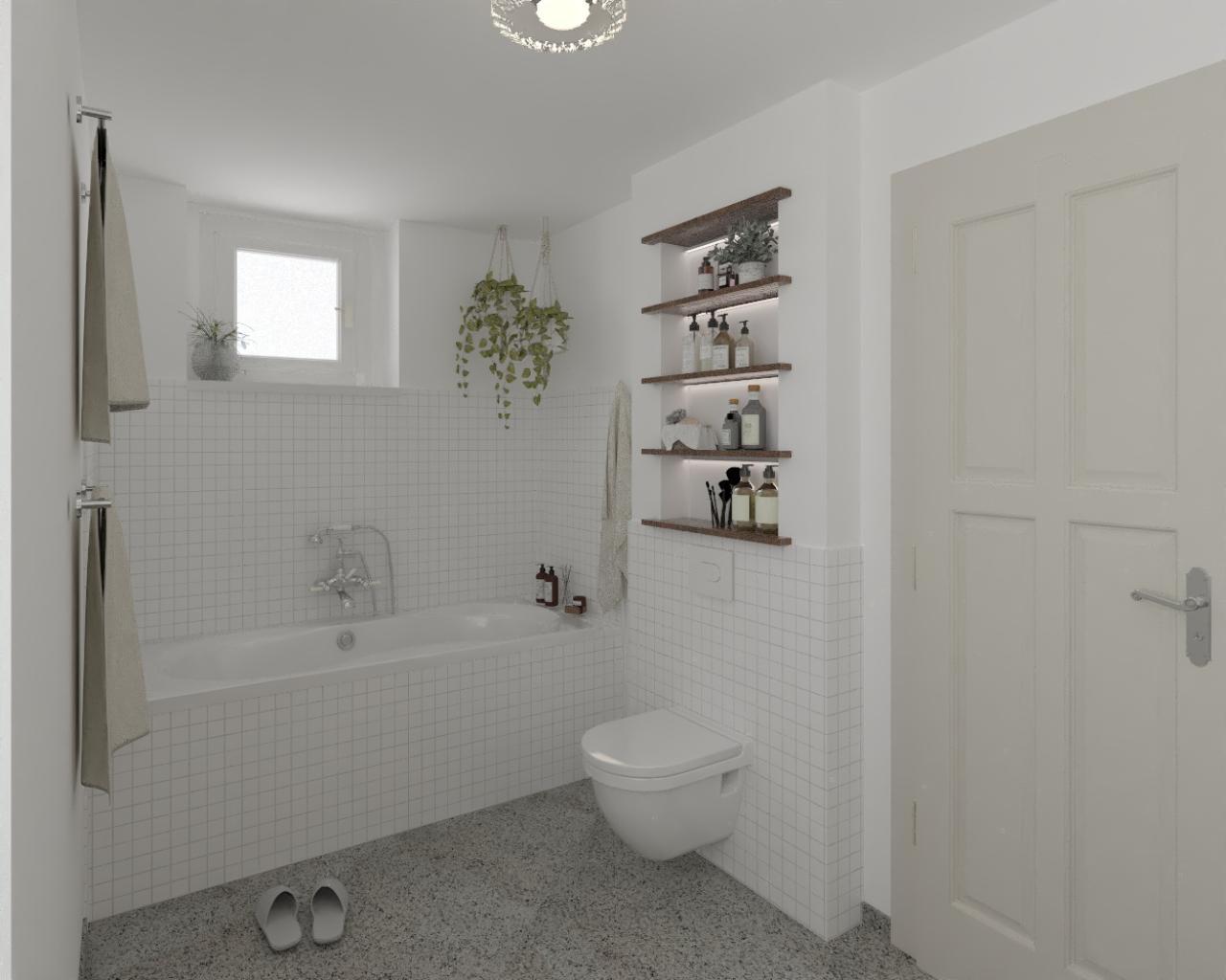 Důraz na kvalitní materiály a promyšlené detaily podtrhuje výjimečný charakter tohoto interiéru. Živé rostliny zavěšené v jutových macramé závěsech přinášejí do interiéru kousek přírody a oživují neutrální paletu barev. Jejich zelené listy vytvářejí svěží akcent a propojují interiér s venkovním prostředím. Závěrem nahlédneme do světlé koupelny, která s citem navazuje na prvorepublikovou estetiku, avšak s moderním pojetím. Čisté bílé tóny dominují prostoru a vytvářejí pocit svěžesti a hygieny.