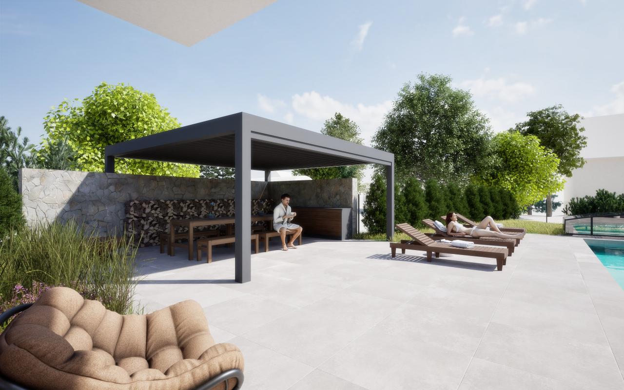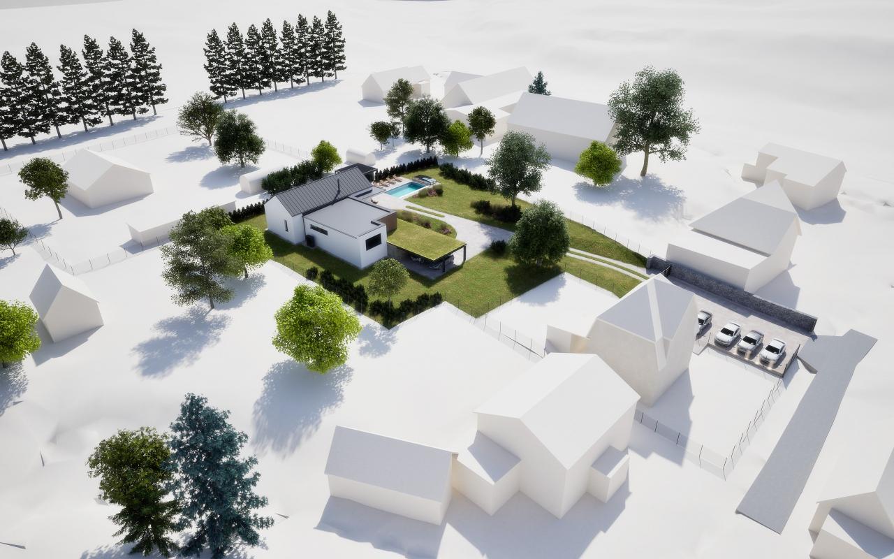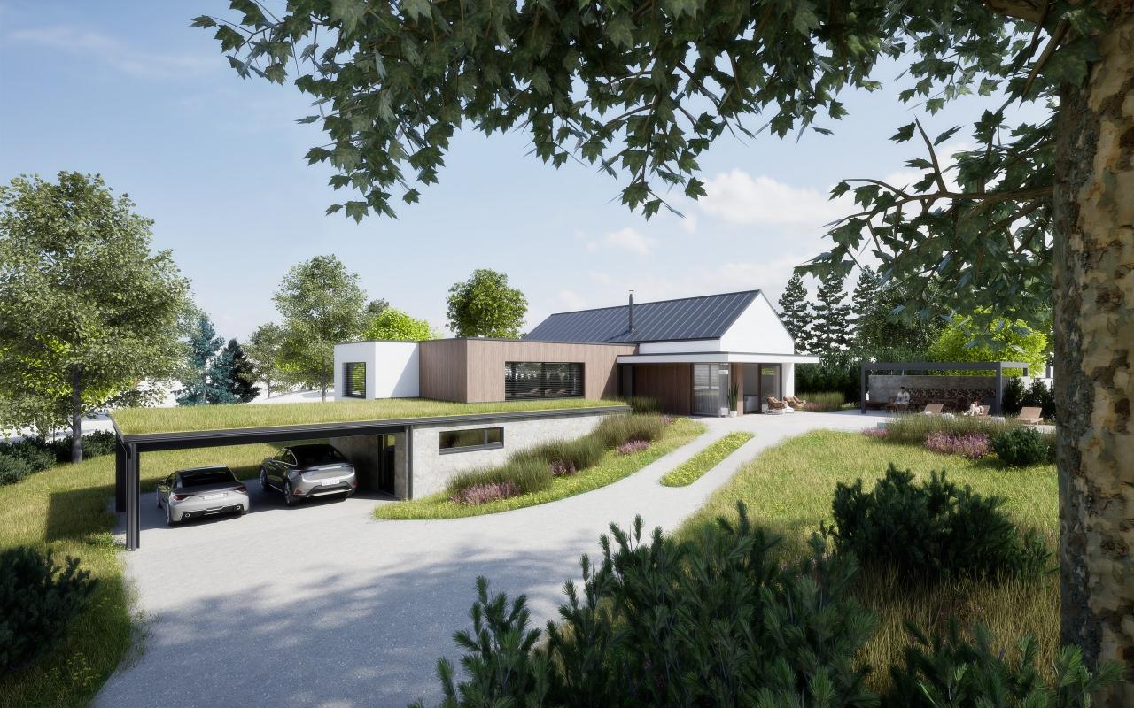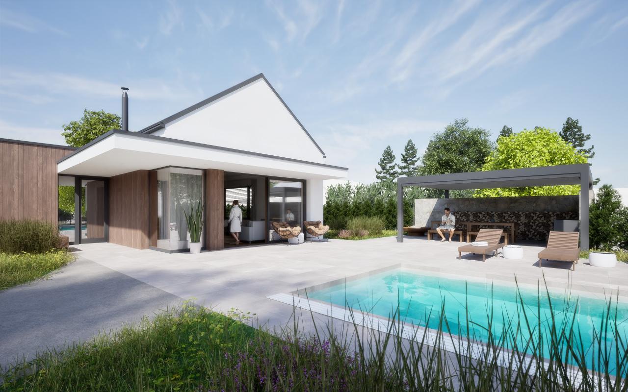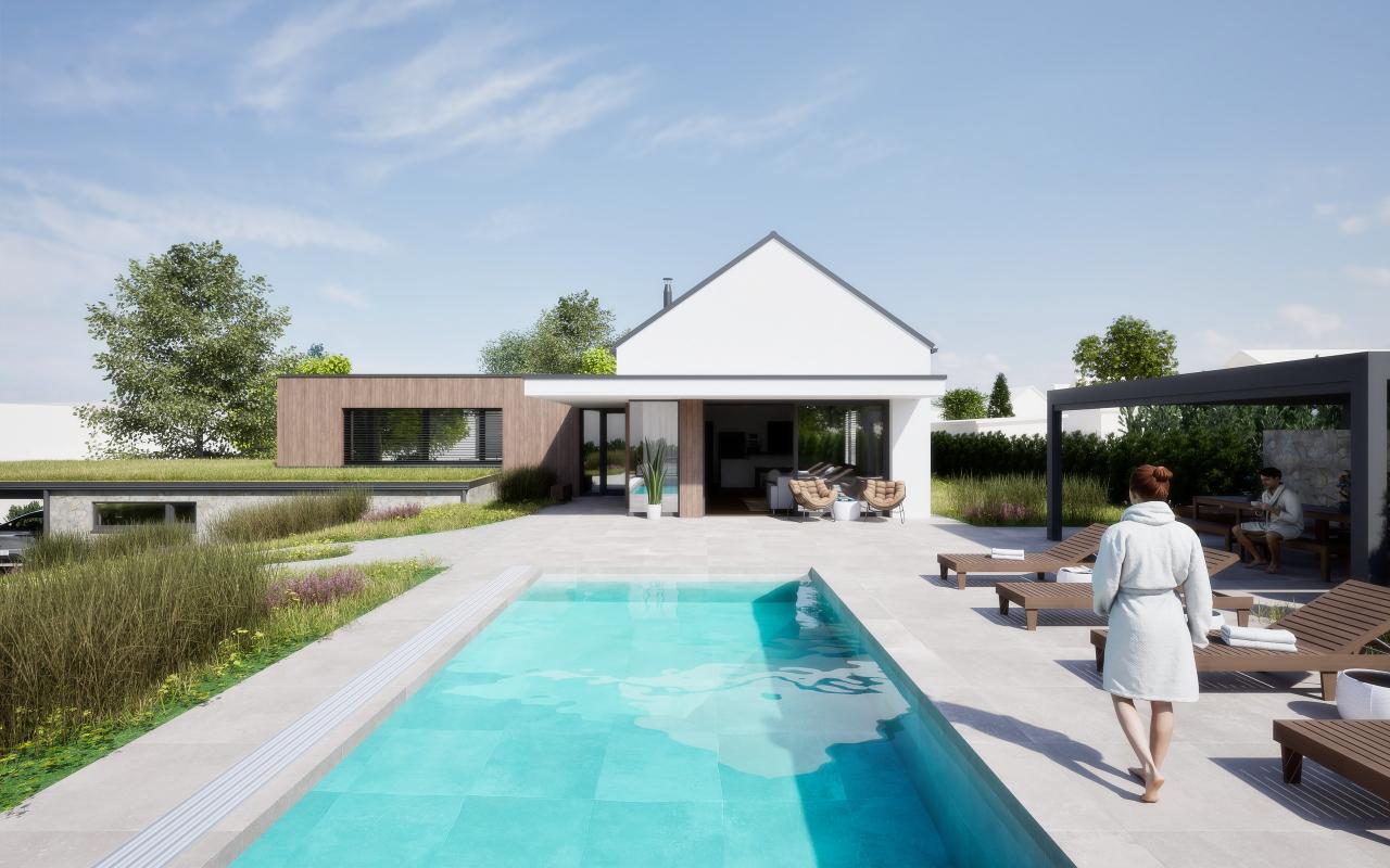 Trutnov - Volanov | zelená střecha | bezrámové rohové okno | bazén | altán