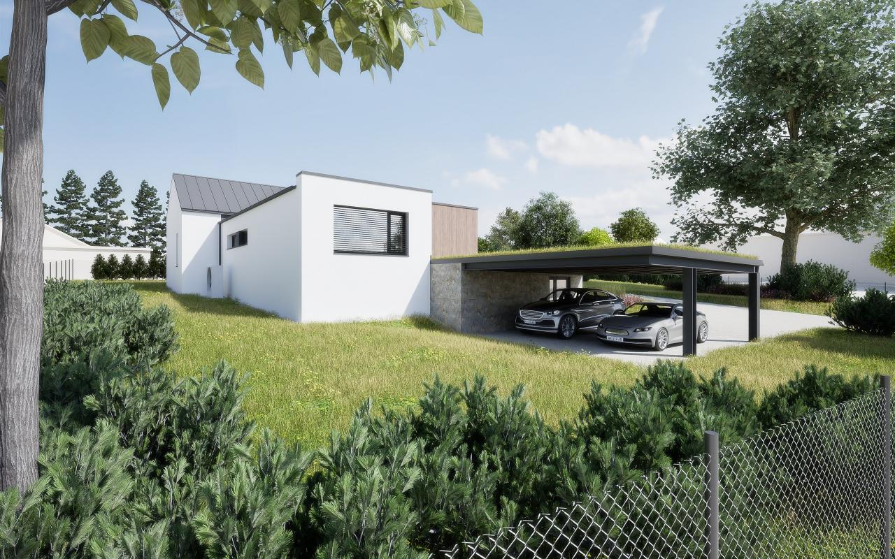 V případě potřeby je možné dojet autem až do úrovně přízemí domu. Standardně budou auta parkovat pod přístřeškem se zelenou střechou, který se nachází půl patra pod přízemím a přirozeně navazuje na stávající terén.