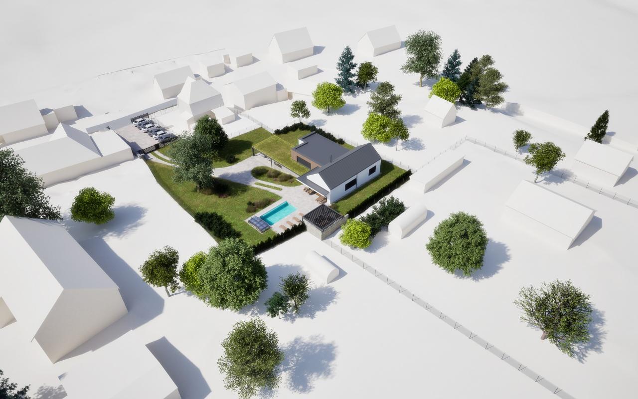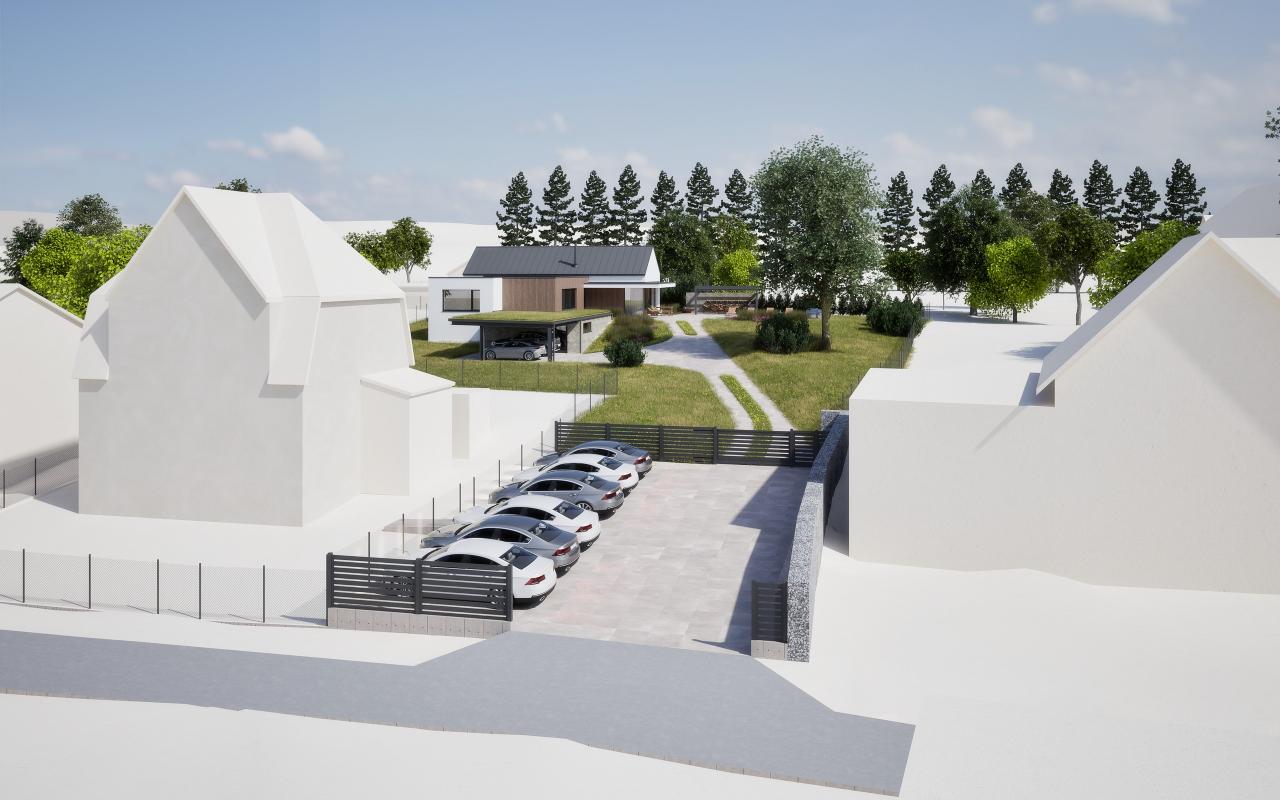 Prostor pro dům se nachází na pozemku stávajícího domu. Součástí návrhu proto byla také nová příjezdová cesta včetně řešení parkovacích stání pro oba domy.