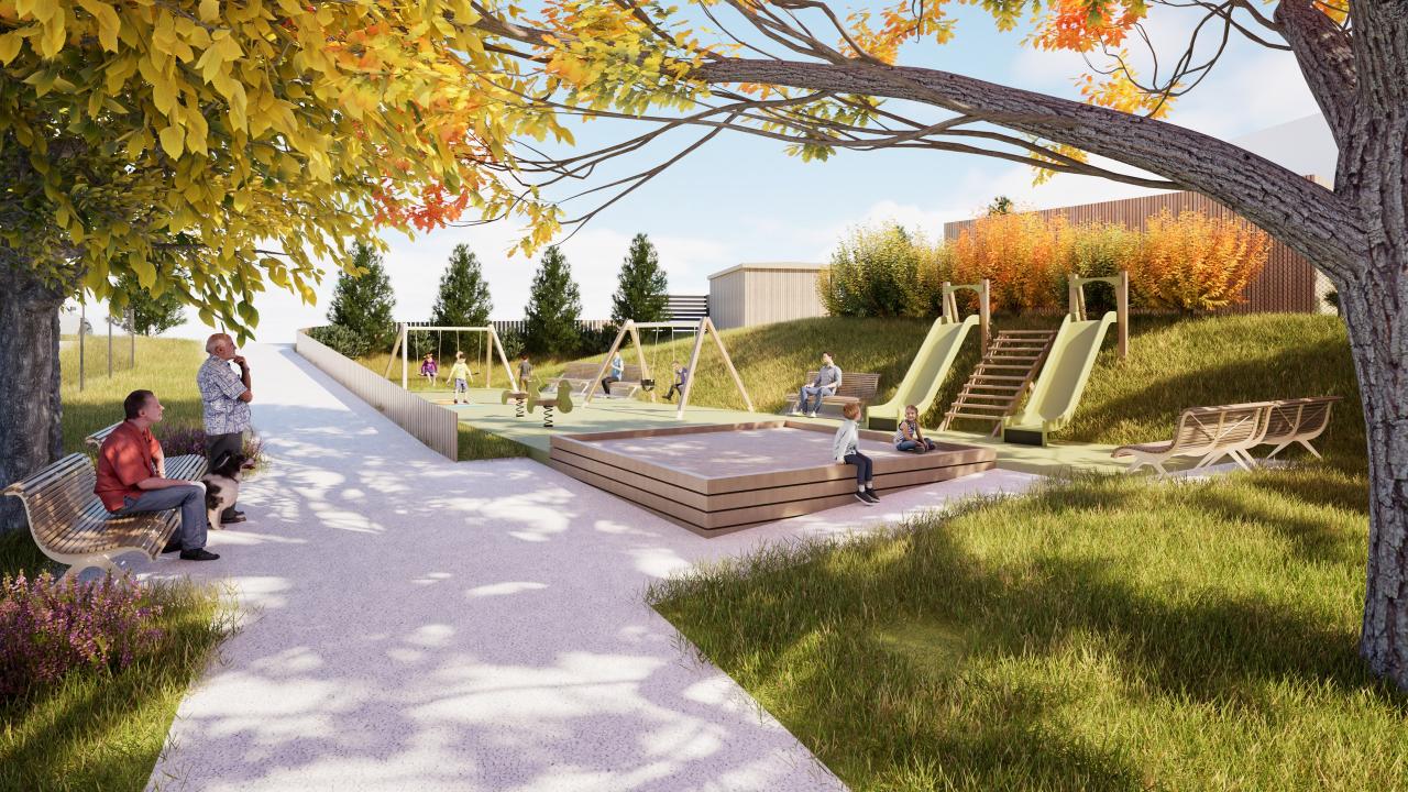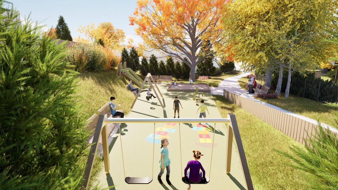 Řešené území nově protíná mlatová cesta pro pěší s dětským hřištěm pod korunou stávajících habrů. Chodník v Mánesově ulici je prodloužen až k basebalovému hřišti.
