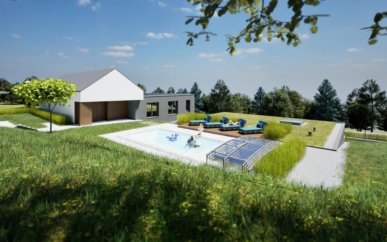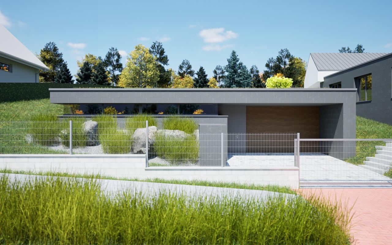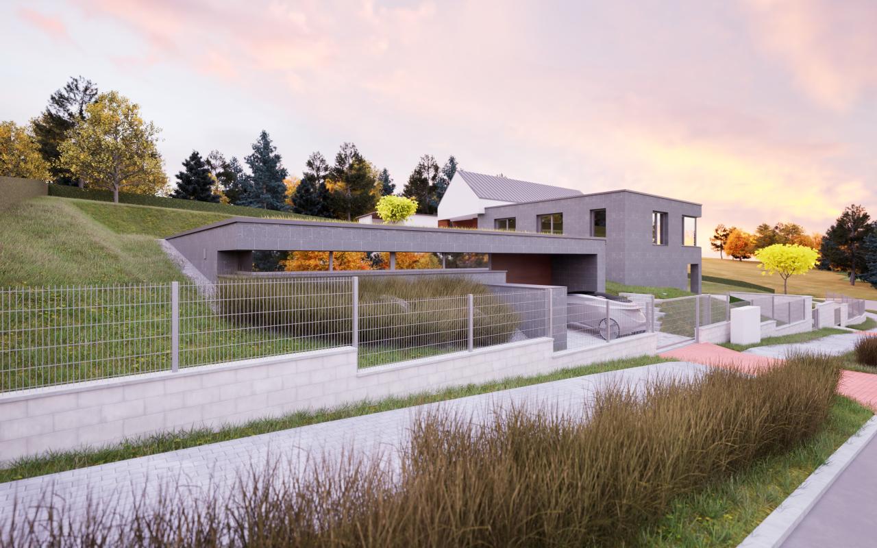 Úkolem bylo navrhnout doplňkovou stavbu ke stávajícímu rodinnému domu, která bude sloužit jako garáž, sklad a wellness.